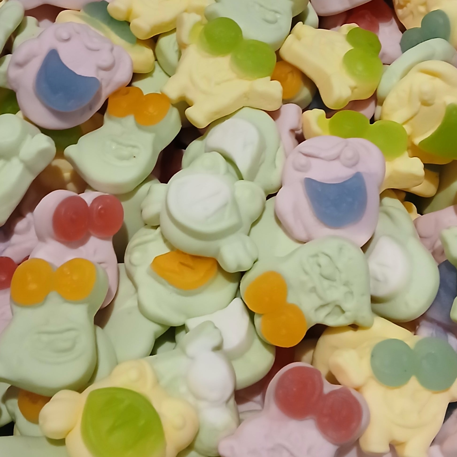 Soft, squishy, and monstrously delicious! These colourful foam sweets are shaped like cheeky little monsters, each topped with fruity jelly details like big silly eyes or wide grins. Bursting with playful flavours and a light, fluffy texture, they’re the perfect treat for kids’ parties, Halloween fun, or anyone who loves a sweet with character.