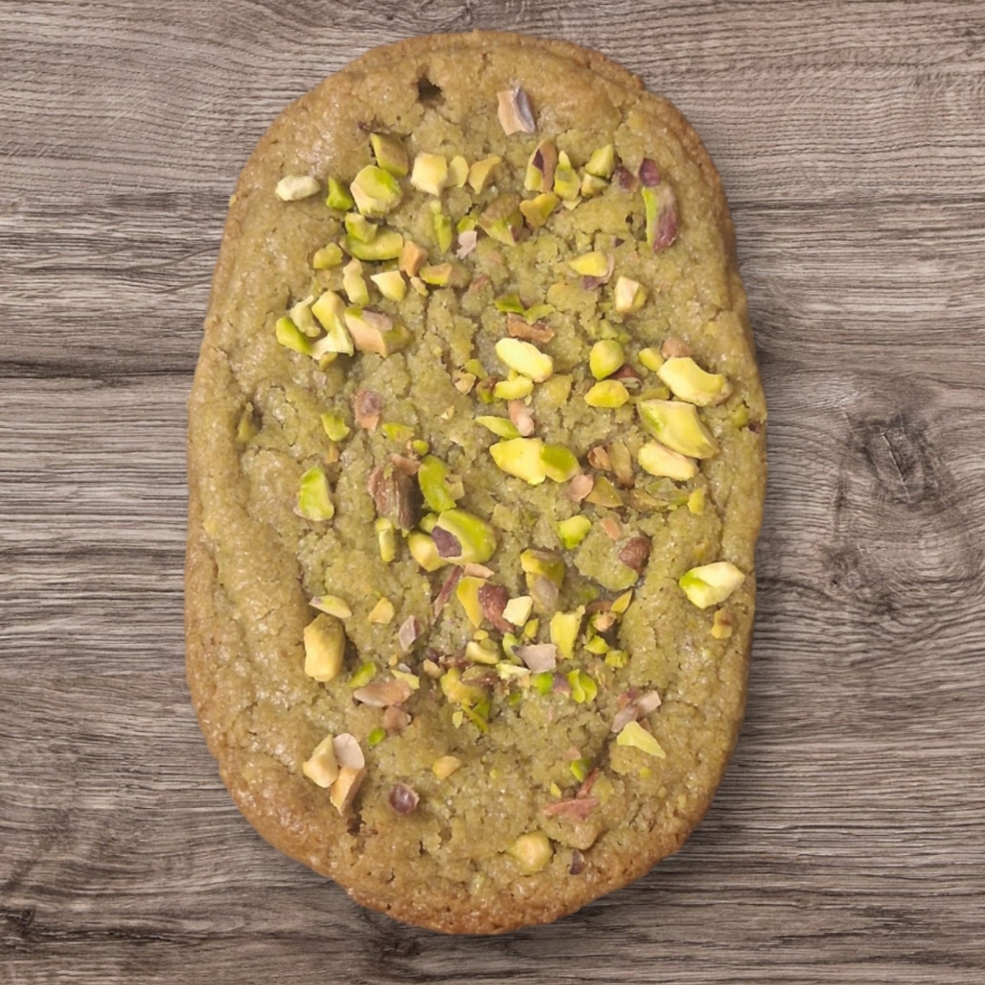 A soft, nutty green cookie packed with chopped pistachios and boosted with pistachio flavouring for a rich, authentic taste. Once baked, it’s finished with an extra sprinkle of chopped pistachios for added crunch and colour. A must-try for any pistachio lover.